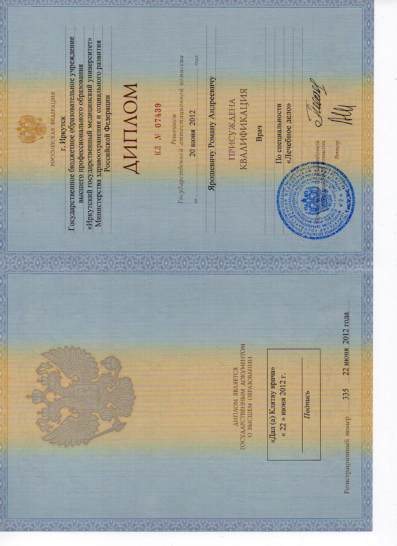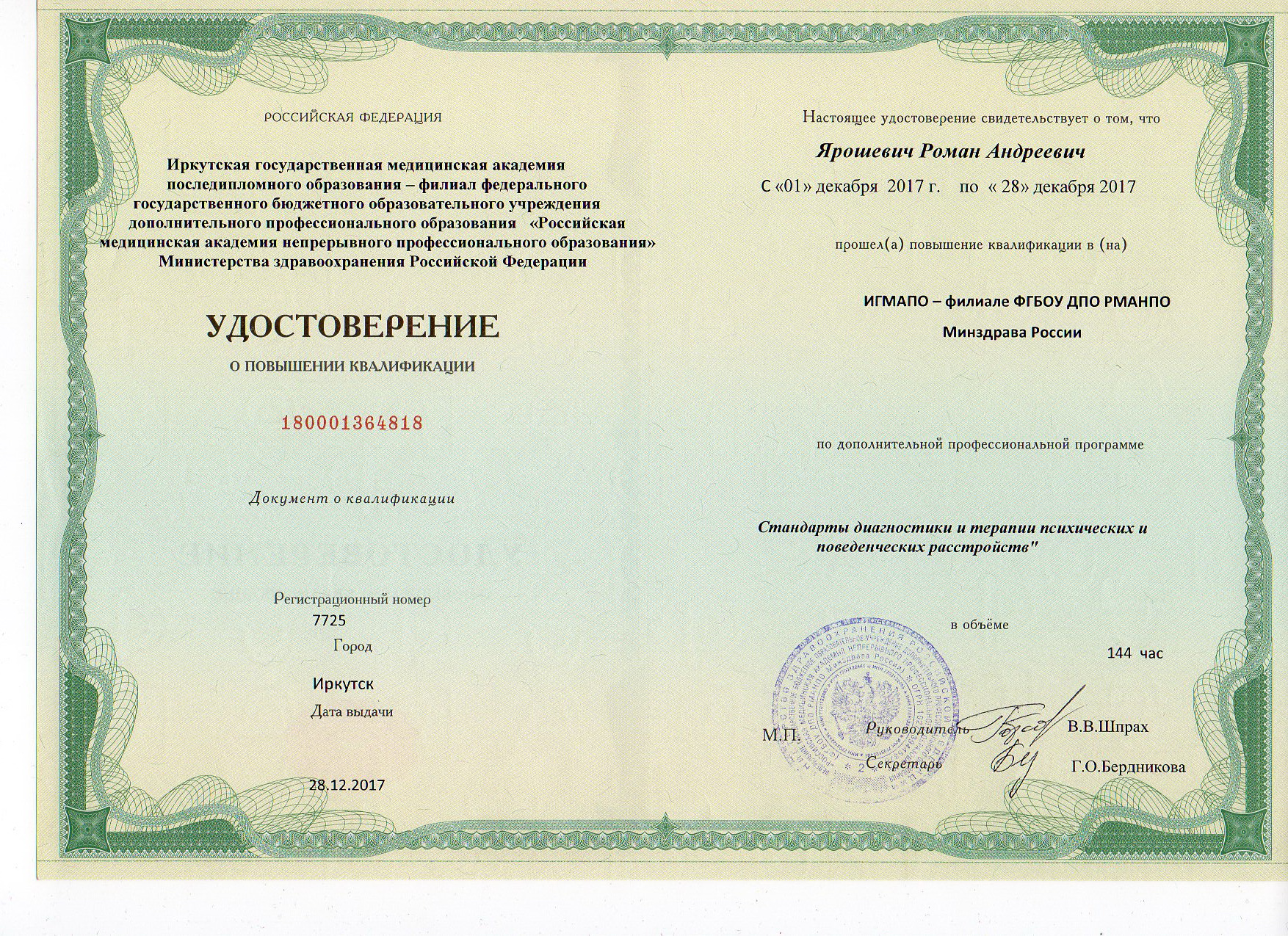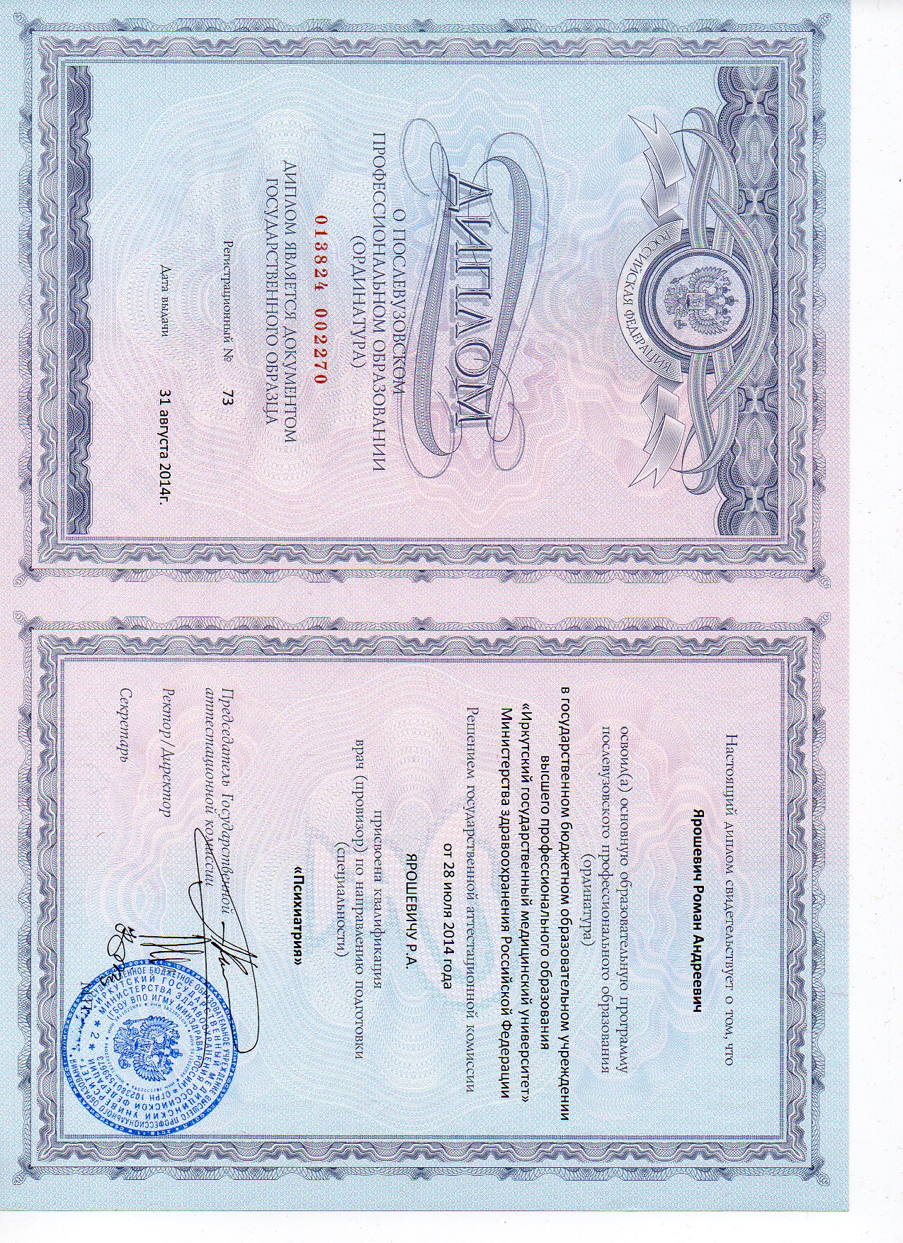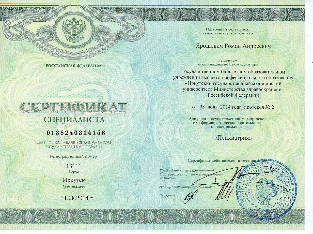 Сертификат специалиста «Психиатрия», г. Иркутск — 2014