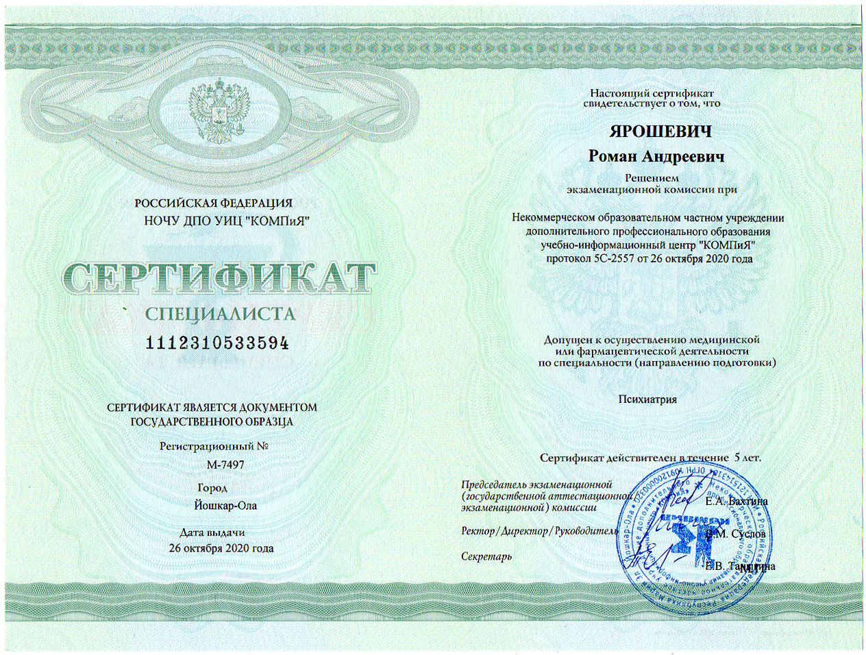 Сертификат специалиста «Психиатрия», г. Йошкар-Ола — 2020
