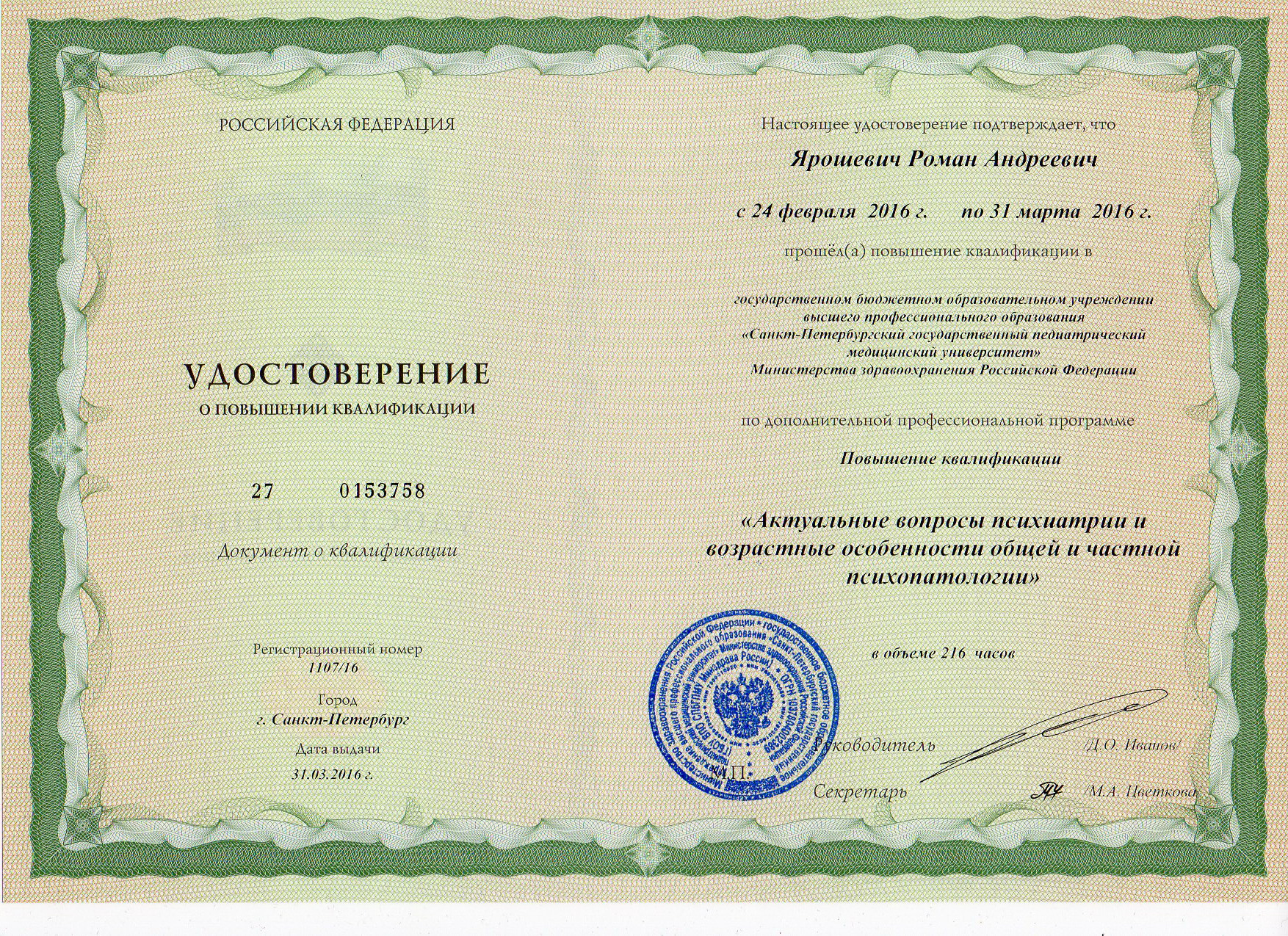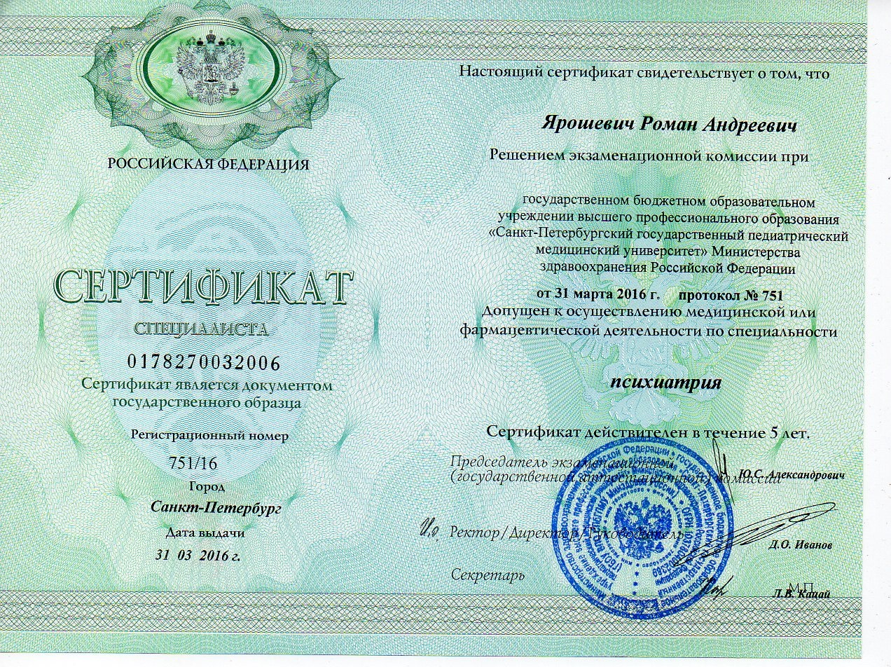 Сертификат специалиста «Психиатрия», г. Санкт-Петербург — 2016